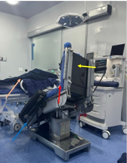 Red arrow: Show the direction of the unexpected table tilt. Yellow arrow: Point to the head section of the table. Blue arrow: Point to the foot section. Orange arrow: Shows the patient hemodynamically stable after the incident, it's positioned on an auxiliary stretcher, allowing safe airway management and preparation for transfer to another operating room.