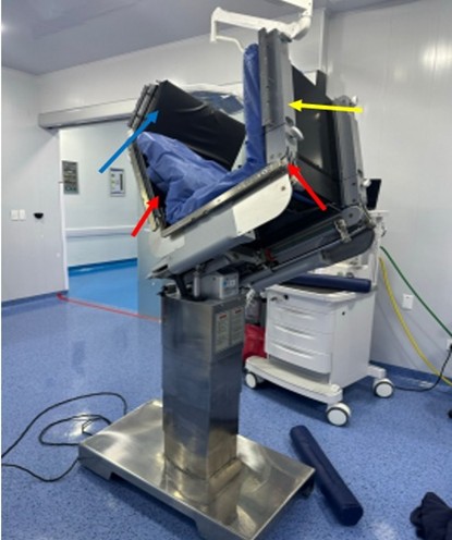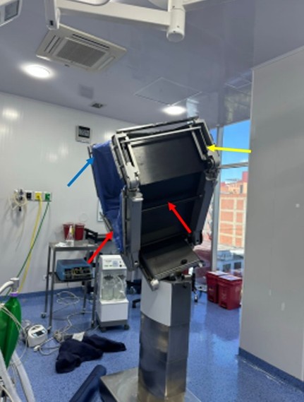 Figure 3: Surgical table in continuous movement, acquiring an elevated position. Red arrow: Show the direction of the unexpected table tilt. Yellow arrow: Point to the head section of the table. Blue arrow: Point to the foot section.