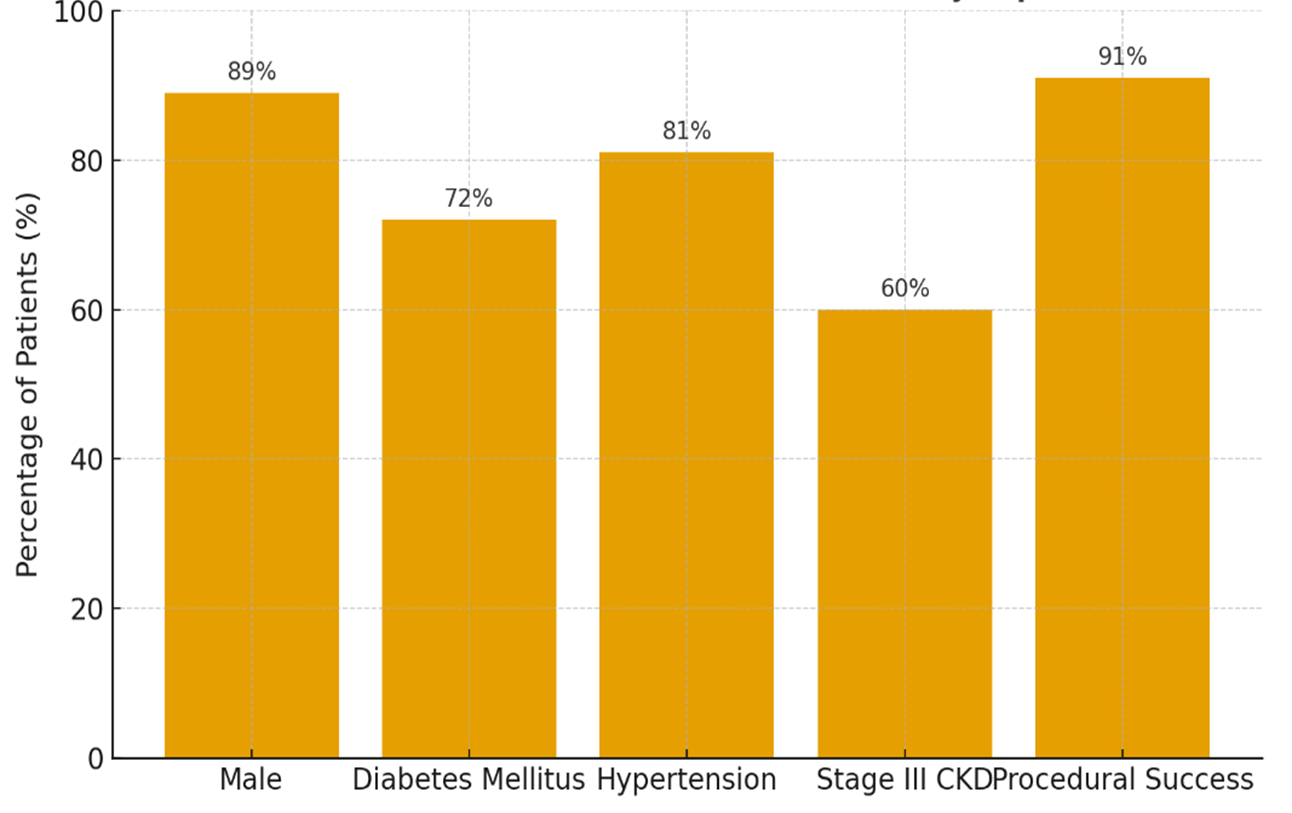 A total of 130 retired military patients with concomitant critical limb ischemia (CLI) and chronic kidney disease (CKD) were enrolled in this study. Baseline characteristics were: mean age 68.2 ± 5.7 years, 89% male, 72% with diabetes mellitus, 81% with hypertension, and 60% with stage III CKD (eGFR 30–59 mL/min/1.73 m²). Procedural success (residual stenosis <50%) was achieved in 91% of cases (Figure 1)