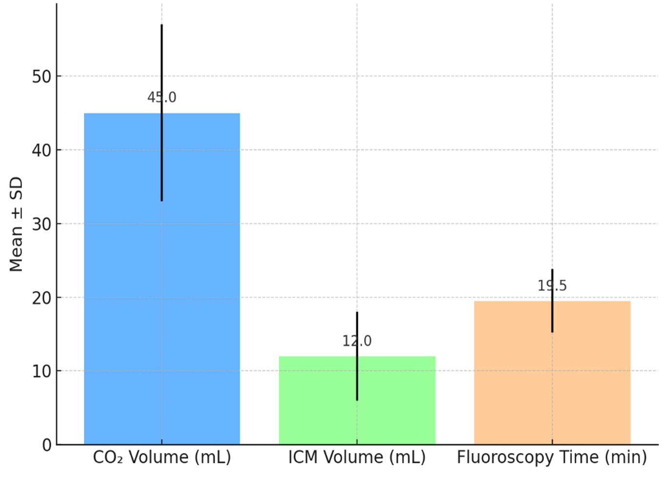 The mean volume of CO₂ used during angiography was 45 ± 12 mL; in 27 patients (20.8%) a bailout volume of iodinated contrast media (ICM) of 12 ± 6 mL was required. Mean fluoroscopy time was 19.5 ± 4.3 minutes. No major procedural complications (e.g., gas embolism, vessel rupture) occurred (Figure 2).