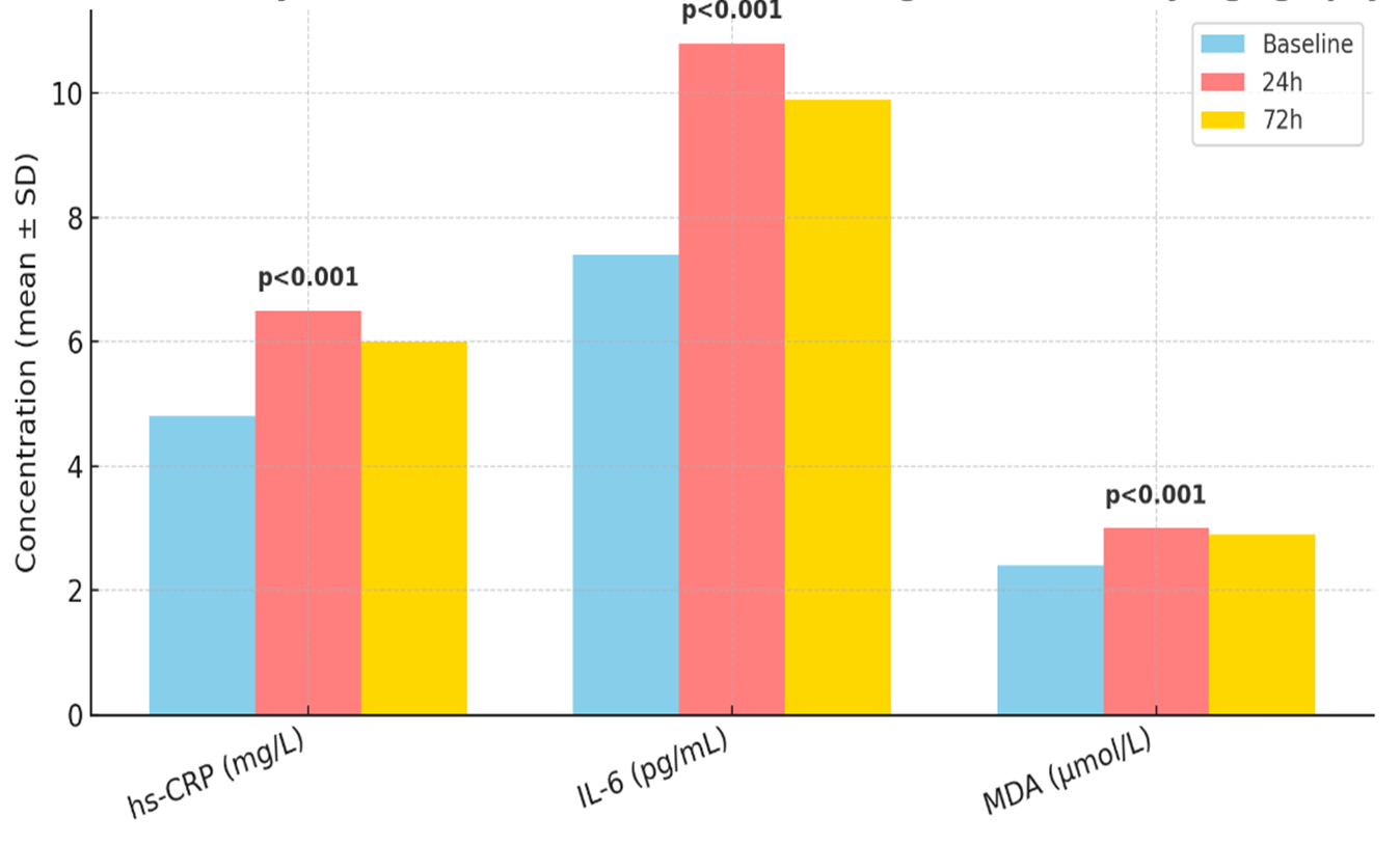 High-sensitivity C-reactive protein (hs-CRP) baseline was 4.8 ± 2.2 mg/L. At 24 hours, it increased to 6.5 ± 2.9 mg/L (p < 0.001), and at 72 hours to 6.0 ± 2.7 mg/L (p = 0.002). Interleukin-6 (IL-6) rose from 7.4 ± 3.1 to 10.8 ± 4.5 pg/mL at 24 h (p < 0.001) and 9.9 ± 4.2 pg/mL at 72 h (p = 0.003). Malondialdehyde (MDA) as a marker of oxidative stress increased from 2.4 ± 0.6 to 3.0 ± 0.7 µmol/L at 24 h (p < 0.001) and remained elevated at 2.9 ± 0.6 µmol/L at 72 h (p = 0.002) (Figure 3). These data demonstrate that even with the kidney-sparing contrast modality, systemic inflammatory and oxidative responses occur post-angiography.