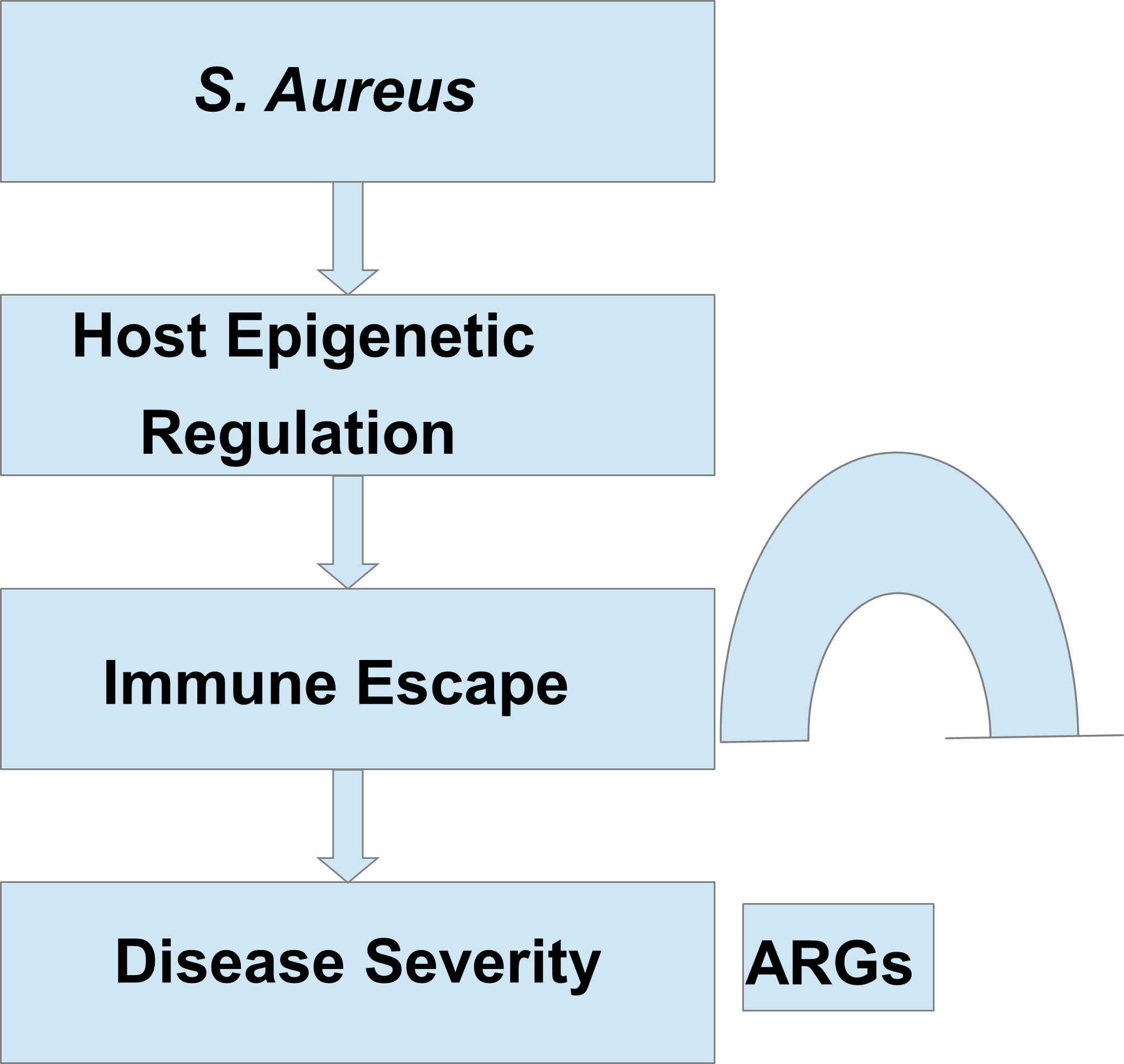 Legend 1. Epigenetic Interactions Between Staphylococcus aureus (S. aureus) and the Host. This diagram illustrates how S. aureus cleverly influences host epigenetic mechanisms to reduce immune system responses. At the same time, the bacterium increases the expression of antibiotic resistance genes (ARGs) to improve its chances of survival in the presence of antimicrobials. The heightened expression of ARGs may further affect the host's epigenetic regulation, creating a self-perpetuating feedback mechanism that fosters immune evasion and intensifies the severity of the infection.
