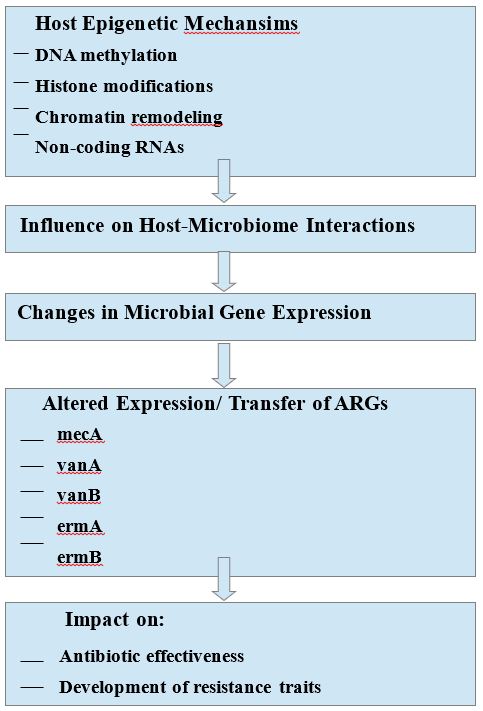 Legend 2. The Role of Host Epigenetics in the Expression of Antibiotic Resistance Genes (ARGs). The diagram suggests that host epigenetic mechanisms like DNA methylation, histone modification, or chromatin remodeling could influence the expression of microbial ARGs such as mecA, vanA, vanB, ermA, or ermB. This epigenetic regulation in the host may affect the microbiome, subsequently influencing the expression or transfer of these genes, which has implications for the effectiveness of antibiotics and the development of resistance traits.